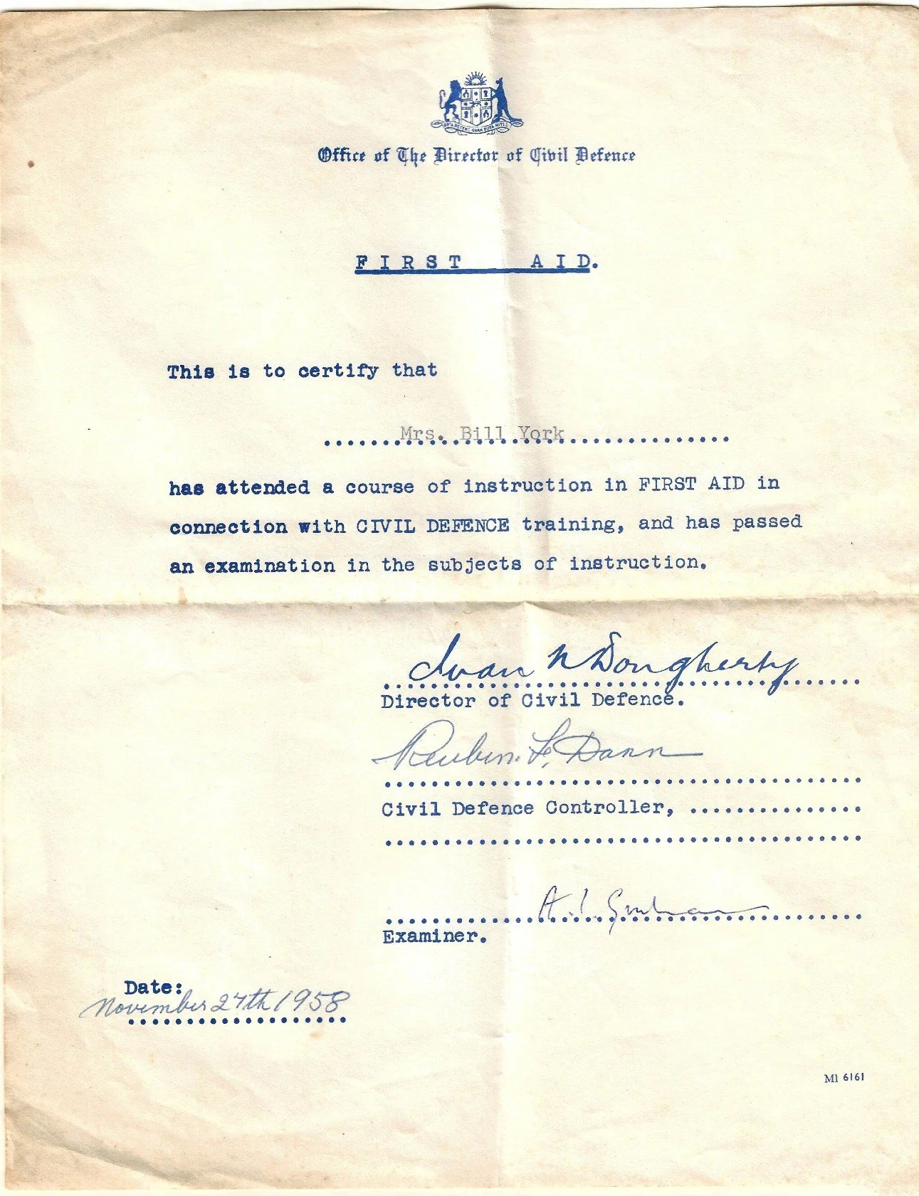 With that my father applied for and successfully completed various industry certificates including his crane drivers’ certificate of competency and his Riggers and Crane Chasing certificates. Occupational Health and Safety was also at the infancy stages of development at this time, and my mother attended courses of instruction in first aid and home nursing.